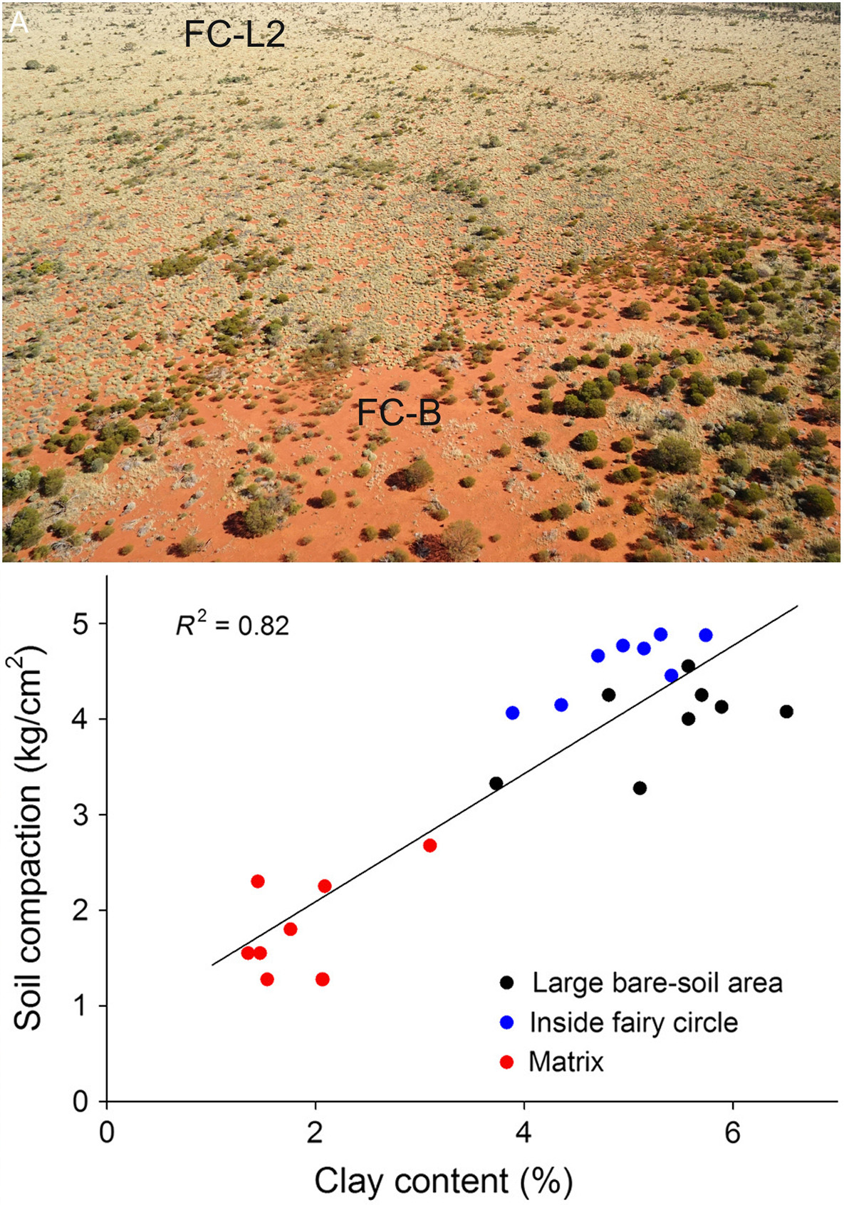 Between 2017 and 2019, we investigated the Australian fairy circles for three years even more in detail. This collaboration with Todd Erickson from Kings Park and Botanic Garden and The University of Western Australia focused again specifically on the mechanisms that cause the circles. Together with other colleagues from Australia and Israel we showed, for example, that the plant-inhibiting mechanical soil crusts within the circles have the same clay content and soil hardness as the large bare-soil areas that border next to fairy circles, and where grass is absent for hundreds of meters. Of course, these large bare-soil areas cannot be explained by termite pavements because these occur only very locally. Our study also showed that cemented termite pavements were largely absent from 154 excavated holes within the fairy circles and we emphasized in our 2019 Ecosphere paper that “partial correlation with aboveground or underground termite (or ant) signs does not imply causation and that such mere correlation needs to be carefully interpreted”. The same paper demonstrates also that common termite gaps in Western Australia are significantly less ordered and with diameters of only 2.2 to 2.5 m, the termite gaps are significantly smaller than fairy circles. Hence, Drepanotermes harvester termites cannot explain the observed structure of the fairy circles.